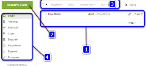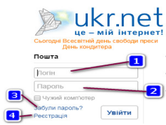 Питання №4: На малюнку зображено стандартний вигляд вікна поштового серверу ukr.net. Що позначено на ньому цифрою 4?