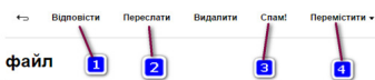 Питання №3: На малюнку зображено стандартний вигляд вікна отриманого листа поштового серверу. Для того, щоб відправити відповідь на даний лист, потрібно обрати пункт позначений цифрою ...