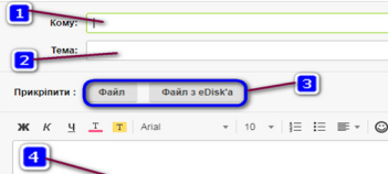Питання №6: На малюнку зображено стандартний вигляд вікна відправлення нового листа поштового серверу ukr.net. Для того, щоб додати файли до листа потрібно обрати пункт позначений цифрою ...