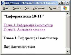 Створення web-ресурсів. Основи HTML (1). Тест 5 Питання №1: Сукупність сторінок, які об’єднані однією загальною темою та розміщених на одному вузловому комп’ютері називається ... програма гіпертекст веб-сайт веб-документ веб-сервер Питання №2: Для реалізації WWW-сервісу використовується мова розмітки гіпермедійних документів (гіпертексту), що називається ... Hyper Text Trasport Protocol World Wide Web Hyper Text Markup Language Post Office Protocol Питання №3: Для переведення текстового курсору на новий рядок (розрив рядка) застосовується тег ... BR BackSpace ENTER HEAD Питання №4: Основою World Wide Web є гіпертекстова структура, зв’язки в якій здійснюються за допомогою посилань. Який тег позначає відправну точку посилання (якір)? ANCHOR P BR A YAKIR Питання №5: Який тег використовується для створення динамічного ефекту – «рухомий текст»? IMG BASE MARQUEE MAP Питання №6: Які теги були використані при створенні форми нижче? <input type='textfield'>, <input type='checkbox'> та <input type='radiobutton'> <input type='text'>, <input type='checkbox'> та <input type='radio'> <input type='text'> та <input type='check'> <input type='text'>, <input type='check'> та <input type='radio'> Питання №7: Скільки стовпців в даному шаблоні? <table> <tr> <td></td><td></td> <td></td> </tr> <tr> <td></td><td></td> <td></td> </tr> </table> Питання №8: Параметри шрифту визначають за допомогою елемента FONT. Які атрибути передбачені для цього елемента? face align color text size Питання №9: Які формати є оптимальними для розташування графічних зображень на веб-сторінках? *.png *.cdr *.jpeg *.gif *.pcx Питання №10: Мова HTML має спеціальні елементи, що дозволяють подавати текстову інформацію у вигляді списків. Визначити зовнішні теги, що задають вид списку TR DL UL OL TD Питання №11: У вікні браузера відображається web-документ, створений з використанням внутрішніх посилань. Відновіть фрагмент HTML-коду документа, поданого на малюнку <H3> "Інформатика 10-11"</H3> <H4><A name="глава1"> Глава 1. Інформація і комп'ютер </A></H4> Далі йде текст глави 2 <BR> <A href="#глава2"> Глава 2. Апаратна частина </A><BR> <A href="#глава1"> Глава 1. Інформація і комп’ютер </A><BR> Питання №12: Встановіть відповідність між тегами, що задають розмітку шрифту, та їх призначенням Виділення курсивом --- <B>…</B> <U>…</U> <I>…</I> <SUP>... </SUР> Задання напівжирного накреслення шрифту --- <B>…</B> <U>…</U> <I>…</I> <SUP>... </SUР> Підкреслення фрагменту --- <B>…</B> <U>…</U> <I>…</I> <SUP>... </SUР> Створення надрядкового символу --- <B>…</B> <U>…</U> <I>…</I> <SUP>... </SUР>